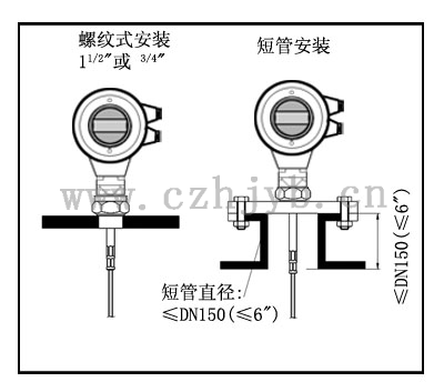 安裝方法 合理安裝能確保儀表長(zhǎng)期可靠而精確的測(cè)量 儀表可采用螺紋連接,螺紋的長(zhǎng)度不要超過150mm,還可以采用在短管上安裝。理想的短管直徑小于150mm,高度小于150mm,若安裝于較長(zhǎng)的短管上,應(yīng)底部固定纜繩或選用對(duì)中支架以避免纜繩與短管末端接觸。 |