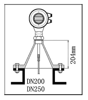 DN200或DN250的安裝于短管內(nèi)安裝 當(dāng)儀表需要安裝于直徑大于200mm短管時(shí),短管內(nèi)壁產(chǎn)生回波,在介質(zhì)介電常數(shù)低的情況下會(huì)引起測(cè)量誤差。因此,對(duì)于一個(gè)直徑為200mm或250mm的短管,需要選一個(gè)帶“喇叭接口”的特殊法蘭。盡量避免安裝在直徑大于250mm的短管上。 |