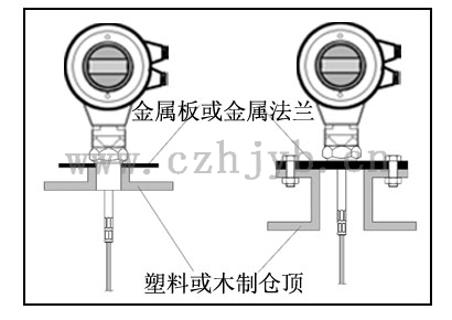 注意! 無論是纜式或桿式若想儀表工作正常,過程連接表面應(yīng)為金屬。當(dāng)儀表裝在塑料罐上時(shí),若罐頂也是塑料或其它非導(dǎo)電材質(zhì)時(shí),儀表需要配金屬法蘭,若采用螺紋連接,需配一塊金屬板。 |