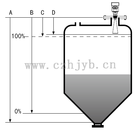 注:使用雷達(dá)物位計時,務(wù)必保證最高料位不能進(jìn)入測量盲區(qū)(圖中D所示區(qū)域)。